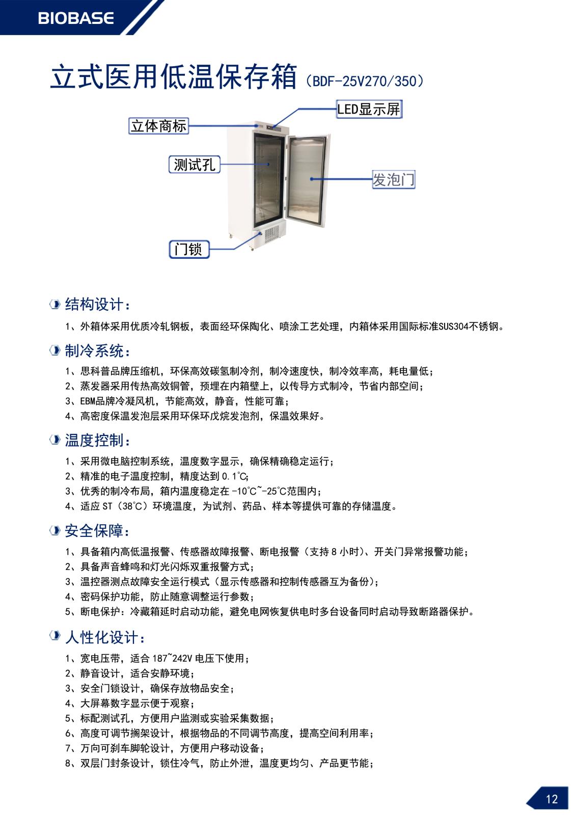 人性化设计:宽电压带,适合187~242V电压下使用;静音设计,适合安静环境;安全门锁设计,确保存放物品安全;大屏幕数字显示便于观察;标配测试孔,方便用户监测或实验采集数据;高度可调节搁架设计,根据物品的不同调节高度,提高空间利用率;万向可刹车脚轮设计,方便用户移动设备;双层门封条设计,锁住冷气,防止外泄,温度均匀、产品节能;